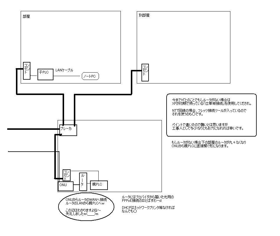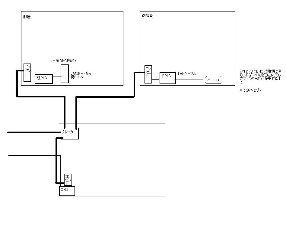 隣のコンセント-子PLC-フラットケーブル~コンセントの中を通り~もきさん部屋-PC なんてこともできたりします。